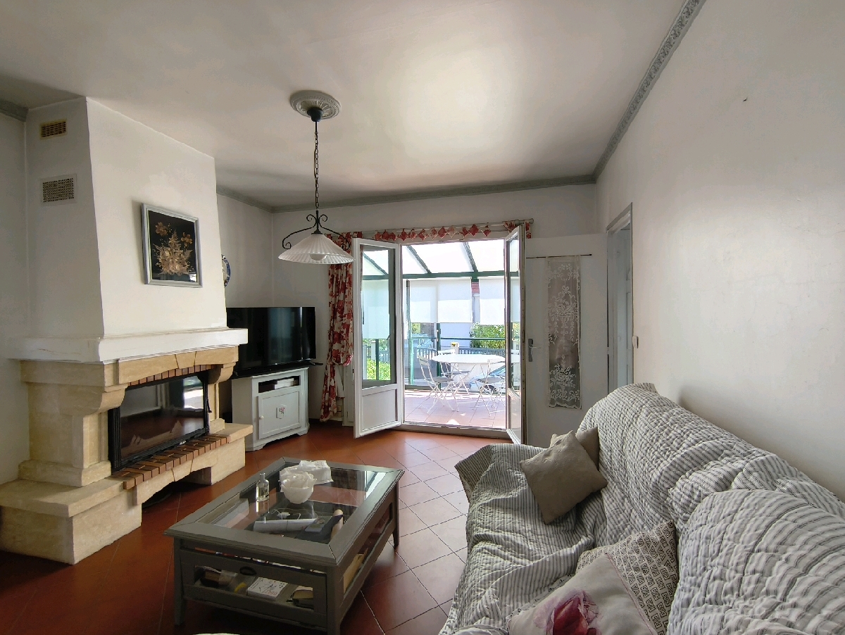 Un séjour accueillant agrémenté dune cheminée insert, créant une atmosphère chaleureuse.