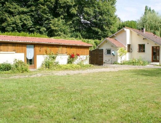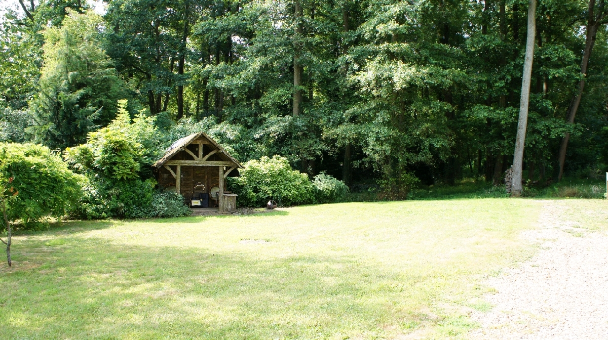 A l’extérieur: jardin dont une partie est arborée et chalet.