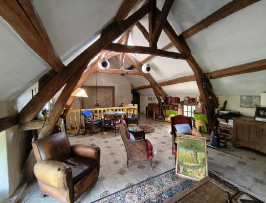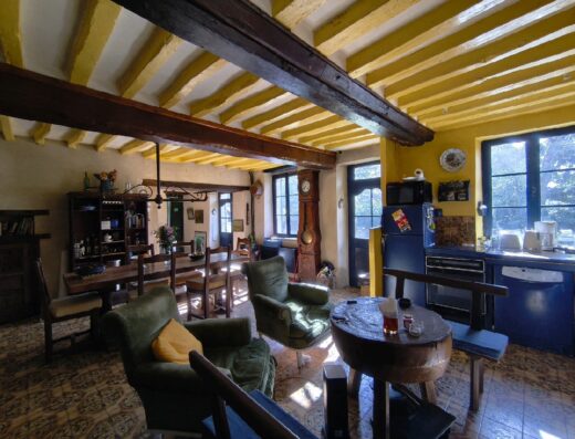 Le rez-de-chaussée s’ouvre sur une entrée avec WC, cuisine aménagée indépendante et ouverte sur la terrasse et le jardin. Le séjour lumineux haut de plafond, avec ses poutres et tomettes est agrémenté dune cheminée à insert, pour des soirée conviviale et chaleureuse.